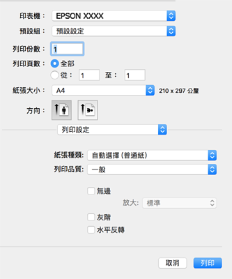 若在 macOS Catalina (10.15) 或更新版本、macOS High Sierra (10.13)、macOS Sierra (10.12)、OS X El Capitan (10.11)、OS X Yosemite (10.10)、OS X Mavericks (10.9)、OS X Mountain Lion (10.8) 中沒有顯示 [列印設定] 功能表,則表示 Epson 印表機驅動程式沒有正確安裝。從下列功能表中啟用它。