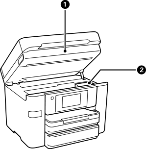 Scans placed originals. Open when replacing ink cartridges or removing jammed paper inside the printer.
