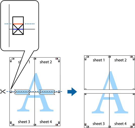 Készítse el Sheet 1ot és a Sheet 2ot. Vágja le az Sheet 1 margóit a függőleges kék vonal mentén, a felső és alsó keresztek középvonalában.