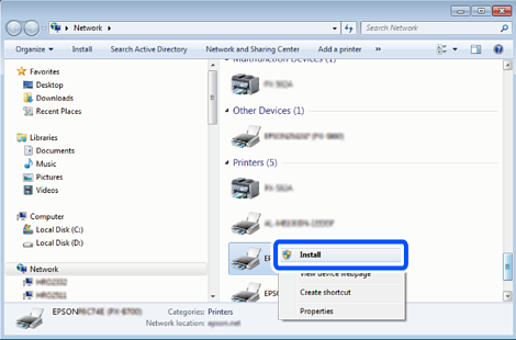 Ar peles labo pogu noklikšķiniet uz printera, pēc tam noklikšķiniet uz Instalēt.