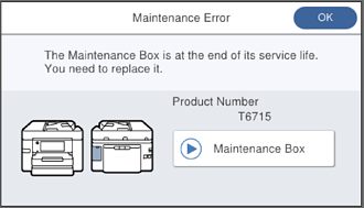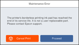 • Kad tiek parādīts tālāk redzamais ekrāns, lietotāji nevar veikt daļas nomaiņu. Sazinieties ar Epson atbalsta dienestu.