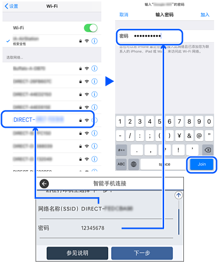 在智能设备的 Wi-Fi 屏幕上,选择本产品操作面板上显示的 SSID,然后输入密码。
