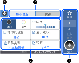 显示设置项目列表。显示 时,您可以选择此图标来查看其他信息。通过选择项目或添加复选标记进行设置。当您更改项目的用户缺省值或出厂缺省值时,该项目上会显示