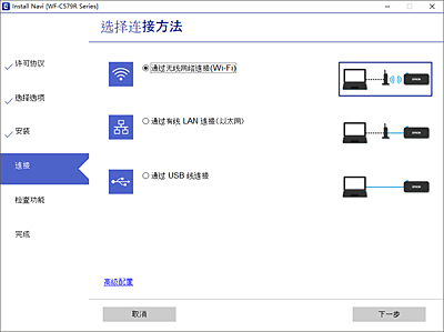 选择要使用的网络连接,通过无线网络连接 (Wi-Fi) 或通过有线 LAN 连接(以太网),然后单击下一步。