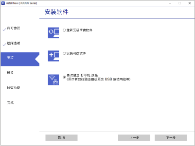 在安装软件屏幕上选择再次建立打印机连接(用于新网络路由器或更改 USB 连接网络等),然后单击下一步。