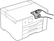 Hvis komponentene og kabinettet er skitne eller støvete slår du skriveren av og rengjør dem med en myk, ren klut som er fuktet med vann. Hvis du ikke kan fjerne skitten kan du prøve å bruke litt mildt rengjøringsmiddel på den fuktige kluten.