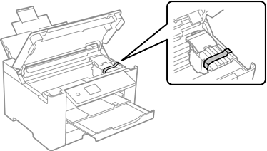 Åpne skriverdekselet. Fest blekkpatronholderen med teip i beholderen.