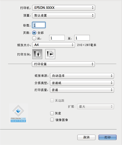 如果 macOS Catalina (10.15) 或更高版本、macOS High Sierra (10.13)、macOS Sierra (10.12)、OS X El Capitan (10.11)、OS X Yosemite (10.10)、OS X Mavericks (10.9)、OS X Mountain Lion (10.8) 中未显示打印设置菜单,则表明未正确安装爱普生打印机驱动程序。从以下菜单启用爱普生打印机驱动程序。