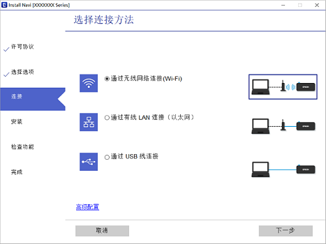 选择要使用的网络连接,通过无线网络连接 (Wi-Fi) 通过有线 LAN 连接(以太网),然后单击下一步