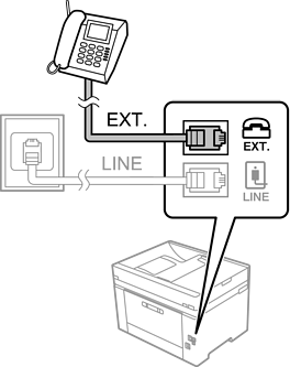 هنگامیکه از یک خط تلفن به صورت مشترک استفاده میکنید، اطمینان حاصل کنید که دستگاه تلفن به پورت EXT. چاپگر وصل شده باشد. اگر برای وصل کردن دستگاه تلفن و چاپگر بهصورت جداگانه، خط را تقسیم کنید؛ چاپگر و تلفن به درستی عمل نخواهند کرد.