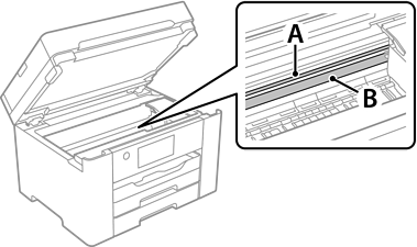 مراقب باشید که ریل (B) را لمس نکنید. در غیر این صورت، ممکن است قابلیت چاپ مختل شود. روغن روی ریل را پاک نکنید زیرا عملکرد ریل مختل میشود.