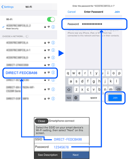 در صفحه Wi-Fi دستگاه هوشمند، SSID را که در پانل کنترل چاپگر نشان داده شده است انتخاب نمایید و سپس رمز عبور را وارد کنید.