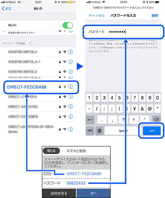 スマートデバイスのWi-Fi接続画面を表示し、プリンターの操作パネルに表示されたSSIDを選択して、パスワードを入力します。