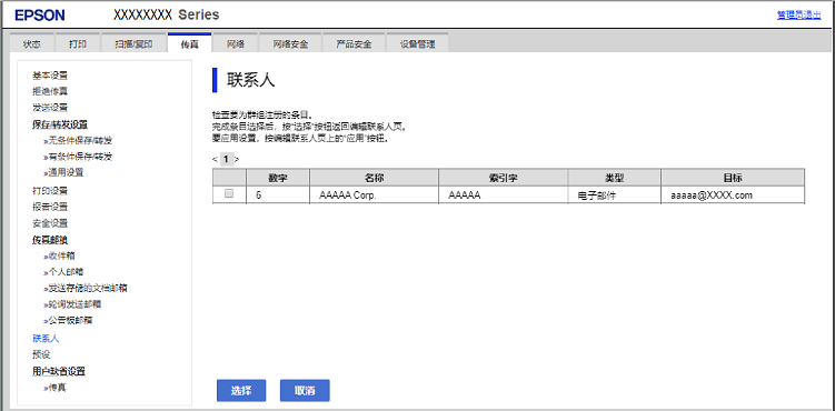 访问 Web Config,然后选择扫描/复印(或传真)标签 > 联系人。