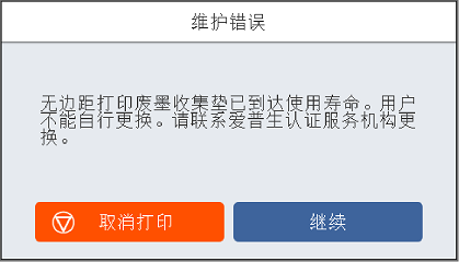 如果维护箱已到达使用寿命,在更换维护箱之前,不能进行打印以及清洗打印头,以免墨水泄漏。但是,您可以执行不使用墨水的操作,例如扫描。