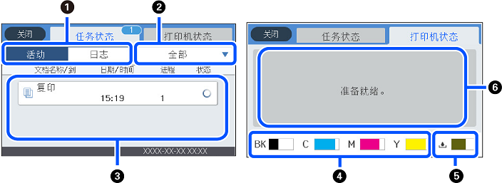 按 按钮可显示状态菜单。您可检查打印机或任务的状态。