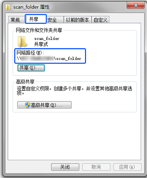 此时会显示共享文件夹的网络路径。注册本产品的联系人时会使用此路径。请将此路径记录下来。