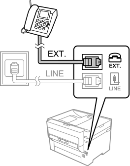 Kada delite jednu telefonsku liniju, postarajte se da telefonski uređaj bude priključen na EXT. priključak na računaru. Ako delite liniju za odvojeno povezivanje telefonskog uređaja i štampača, štampač i telefon neće ispravno raditi.