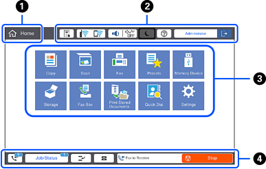 Muestra el estado de la impresora, como el estado de interrupción, el estado de error, el trabajo actual y los faxes sin procesar. |