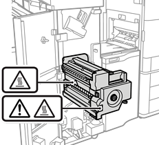 Never touch the areas that are marked with a caution label inside the booklet finisher. Those areas may be very hot and high temperature may cause burns.