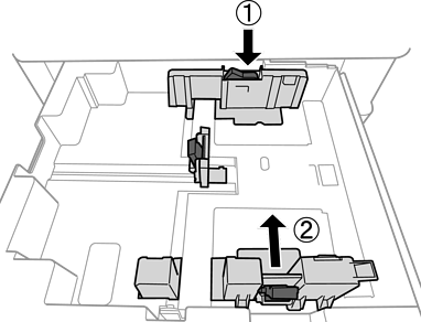 En canviar la posició de les guies laterals a calaix de paper, allibereu el bloqueig de la safata i, a continuació, moveu les guies laterals. Una vegada canviada la posició, bloquegeu la safata de nou.