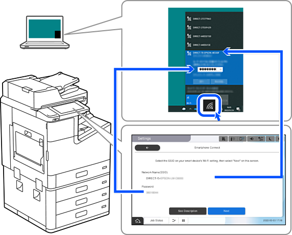 A la pantalla de connexió a la xarxa de l'ordinador, seleccioneu l'SSID que es mostra al tauler de control de la impressora i, a continuació, introduïu la contrasenya.