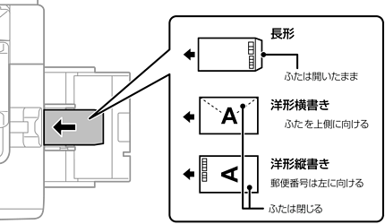 印刷する面を上にして手差しトレイの中央にセットし、用紙ガイドを封筒に合わせてください。