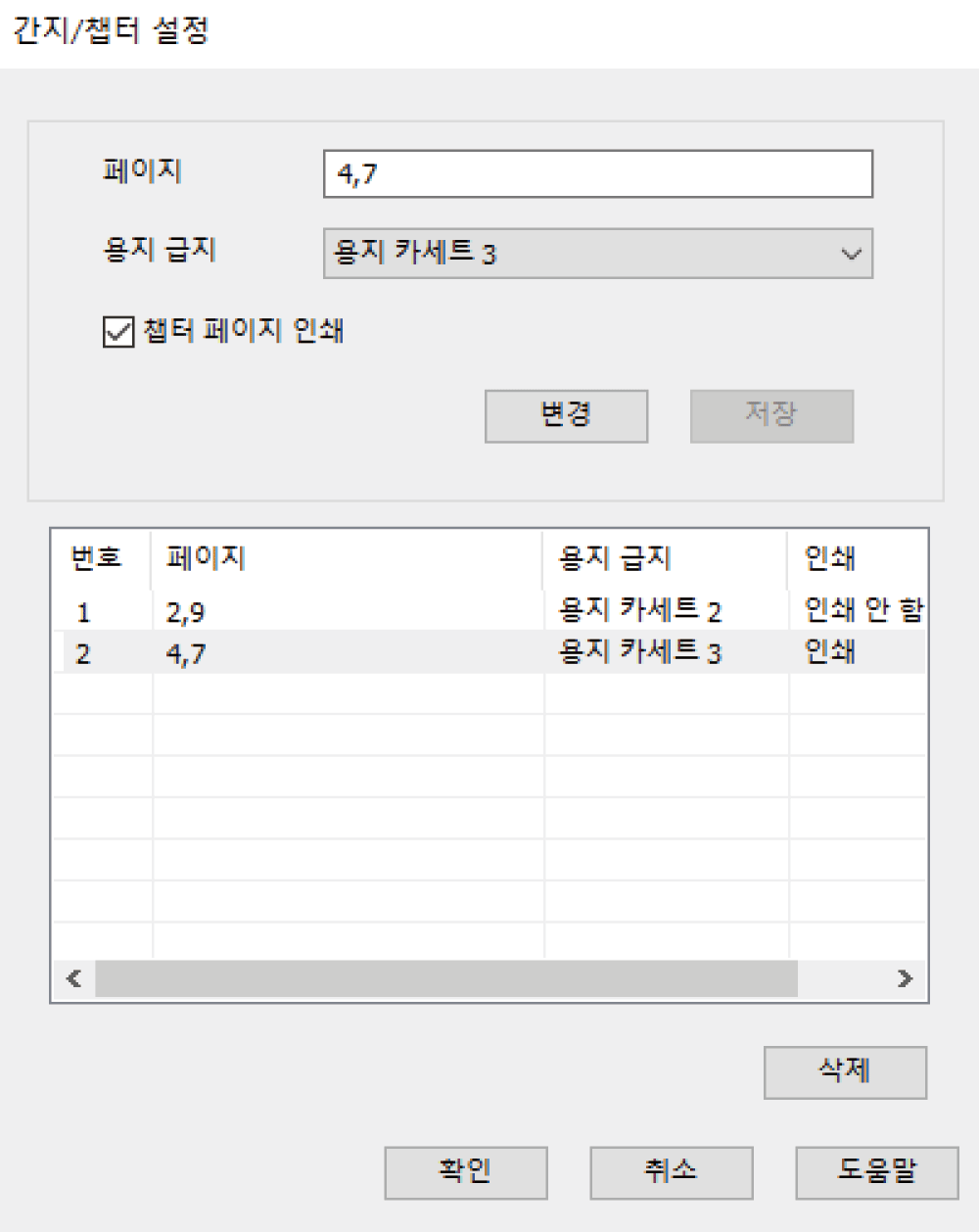 간지를 삽입하거나 챕터를 인쇄할 페이지를 입력합니다. 쉼표를 사용하여 페이지를 구분하고 하이픈을 사용하여 범위를 지정합니다. 예: 2, 9 페이지 앞에 간지를 삽입하려면 "2,9"를 입력하십시오. 그리고 챕터 용지에 4페이지와 7페이지를 인쇄하려면 "4,7"을 입력합니다. 지정된 급지 장치의 용지에 연속 4~7 페이지를 인쇄하려면 "4-7"을 입력합니다. |