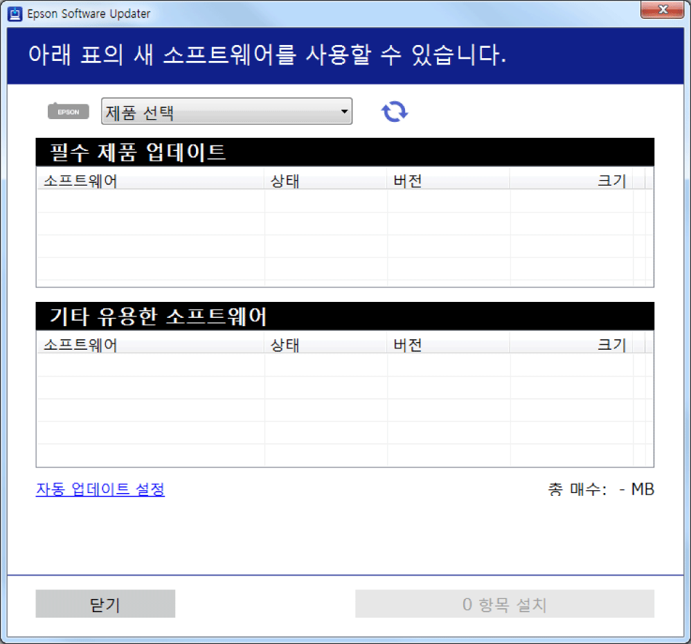 • Windows Server 운영 체제를 사용할 경우 Epson Software Updater를 사용할 수 없습니다. Epson 웹 사이트에서 최신 응용 프로그램을 다운로드 할 수 있습니다.