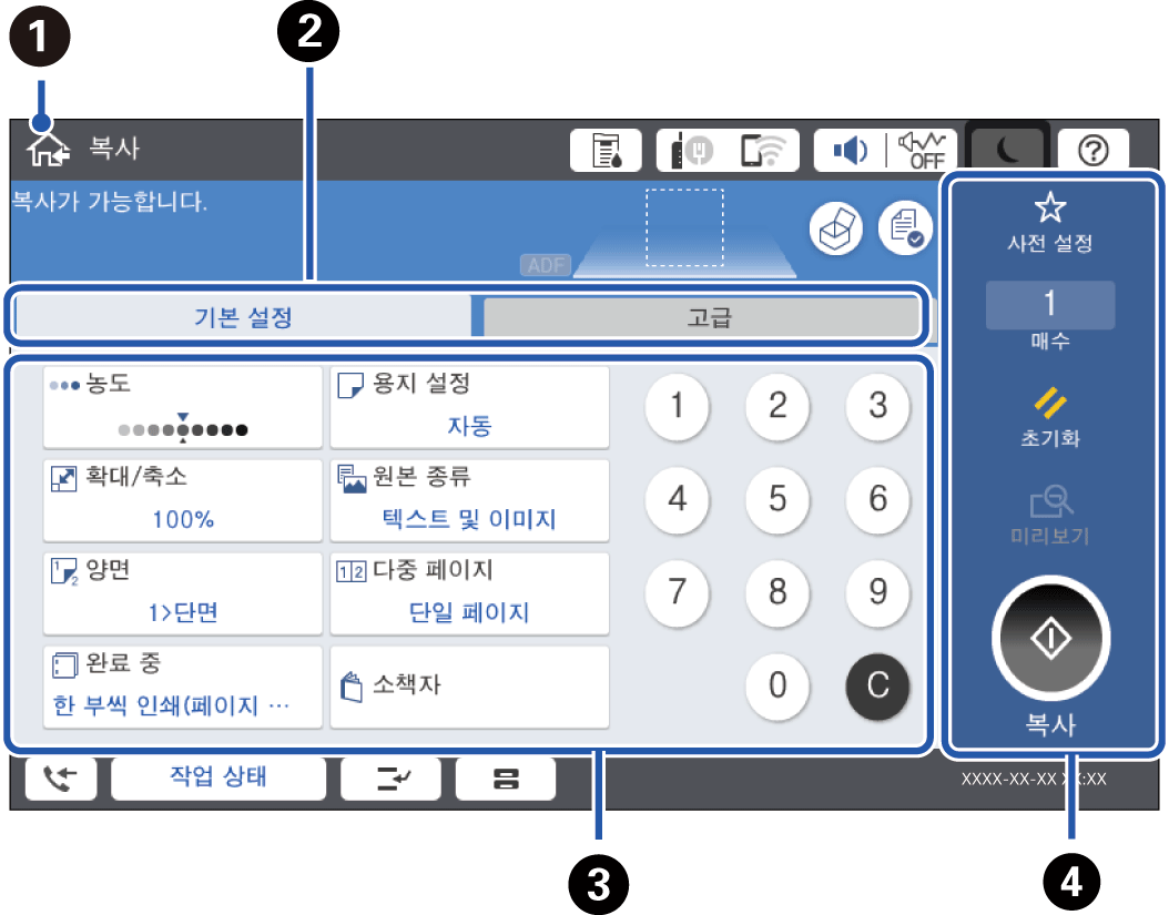 인쇄 매수를 입력할 수 있는 화상 키패드를 표시합니다. |