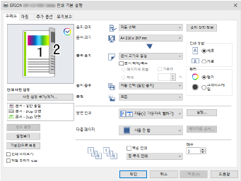 프린터 드라이버 창을 열려면 기본 설정 또는 속성을 선택합니다.