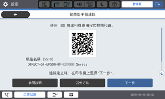 使用 iOS 11 或更新版本上的相機應用。使用 iOS 10 或更新版本上的相機應用無法連接至印表機。此外,使用掃描 QR 碼的應用也無法連接。如果您無法連接,請從印表機控制面板上選取 [其他方法]。有關連接的詳細說明,請參考以下相關資訊連結。