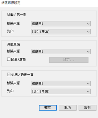按下 [確定] 以關閉 隔頁/章節設定 畫面,然後按下 [確定] 以關閉 紙張來源設定 畫面。