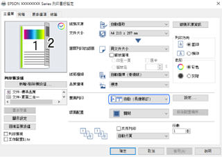 在印表機驅動程式畫面上顯示 [主選單] 索引標籤,然後從 [雙面列印] 選取 [自動 (長邊裝訂)]。