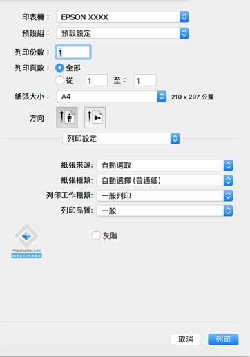 若在 macOS Catalina (10.15) 或更新版本、macOS High Sierra (10.13)、macOS Sierra (10.12)、OS X El Capitan (10.11)、OS X Yosemite (10.10)、OS X Mavericks (10.9)、OS X Mountain Lion (10.8) 中沒有顯示 [列印設定] 功能表,則表示 Epson 印表機驅動程式沒有正確安裝。從下列功能表中啟用它。