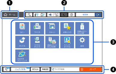 エラーや実行中のジョブ、割り込み中、未読ファクスなどの有無が表示されます。 |