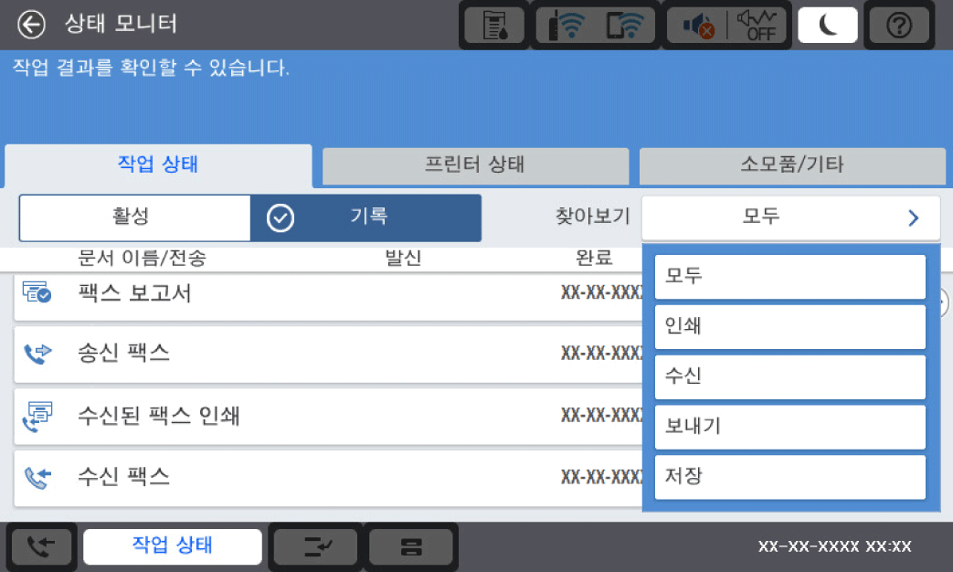 진행 중인 팩스 작업을 확인하거나 작업 기록을 확인할 수 있습니다.