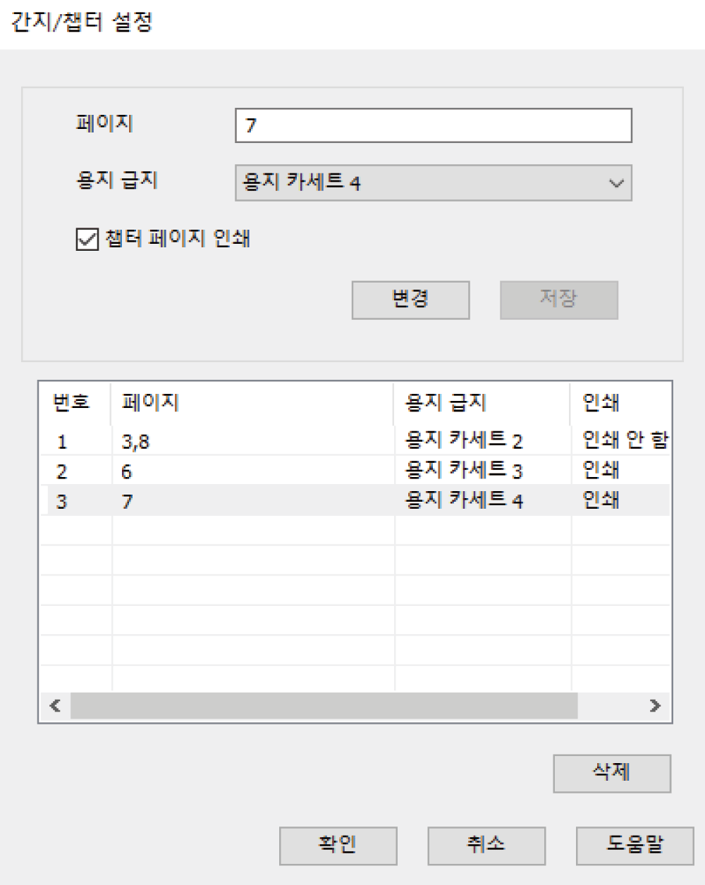 확인을 클릭하여 간지/챕터 설정 화면을 닫은 다음, 확인을 클릭하여 용지 급지 설정 화면을 닫습니다.