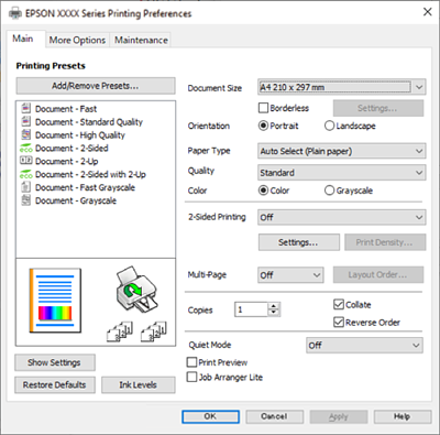 Vælg Indstillinger eller Egenskaber for at åbne printerdrivervinduet.
