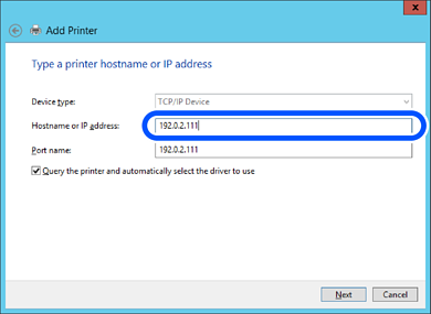 Indtast printerens IP-adresse eller printernavnet i Værtsnavn eller IP-adresse eller Printernavn eller IP-adresse, og klik derefter på Næste.