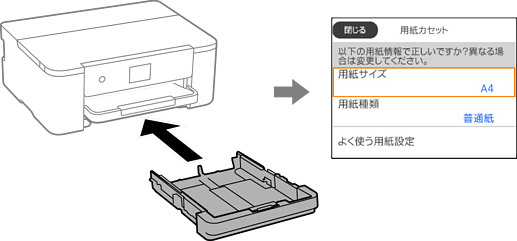 表示された用紙サイズや種類がセットした用紙と異なる場合は、項目を選択して変更してください。このままでいい場合は画面を閉じてください。