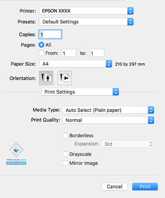 Ak sa ponuka Nastavenia tlače nezobrazuje v systémoch macOS Catalina (10.15) alebo novšom, macOS High Sierra (10.13), macOS Sierra (10.12), OS X El Capitan (10.11), OS X Yosemite (10.10), OS X Mavericks (10.9), ovládač tlačiarne Epson nebol správne nainštalovaný. Povoľte to v nasledujúcej ponuke.