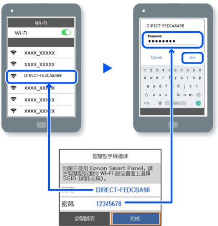 在智慧型裝置的 Wi-Fi 畫面上,選取印表機控制面板上顯示的 SSID,然後輸入密碼。
