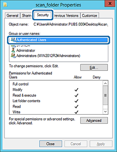 9. セキュリティ]タブを選択し、[グループ名またはユーザー名]にある[Authenticated Users]を選択します。