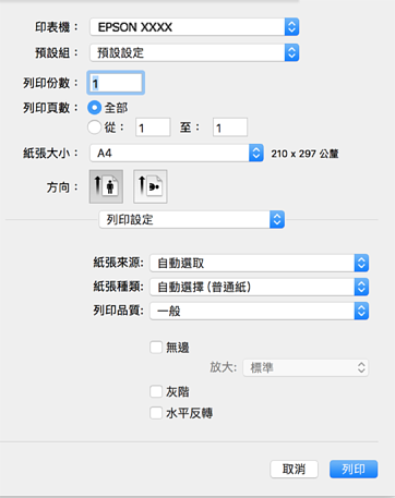 若在 macOS Catalina (10.15) 或更新版本、macOS High Sierra (10.13)、macOS Sierra (10.12)、OS X El Capitan (10.11)、OS X Yosemite (10.10)、OS X Mavericks (10.9)、OS X Mountain Lion (10.8) 中沒有顯示 [列印設定] 功能表,則表示 Epson 印表機驅動程式沒有正確安裝。從下列功能表中啟用它。