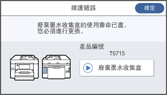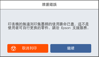 在某些列印循環中,可能會有非常少量的多餘墨水聚集在廢棄墨水收集盒內。為避免從廢棄墨水收集盒漏出墨水,印表機具有可在吸收容量達到廢棄墨水收集盒限制時停止列印的設計。是否需要更換及更換的頻率將會因您的列印頁數、列印的素材類型以及印表機所進行的清潔循環次數而有不同。