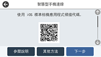 使用 iOS 11 或更新版本上的相機應用。使用 iOS 10 或更新版本上的相機應用無法連接至印表機。此外,使用掃描 QR 碼的應用也無法連接。如果您無法連接,請從印表機控制面板上選取 [其他方法]。有關連接的詳細說明,請參考以下相關資訊連結。