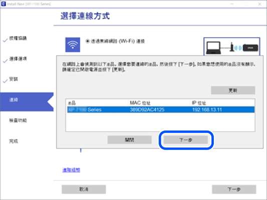 遵循畫面上的指示直到顯示下一畫面,選取您要連接的印表機名稱,然後點選 [下一步]。