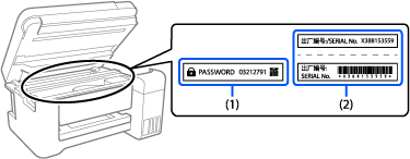 管理员密码的默认值打印在机身标签上,如图所示。贴标签的位置取决于产品,例如在产品里面(需打开打印机盖)、背面或底面。