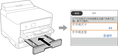 确保在装入打印纸时,您已在显示的屏幕上注册了打印纸尺寸和类型。当注册信息和打印设置不同时,本产品将发出通知。这样可避免由于设置与打印纸类型不匹配而使用不正确的打印纸尺寸或按错误的颜色进行打印,从而防止浪费打印纸和墨水。